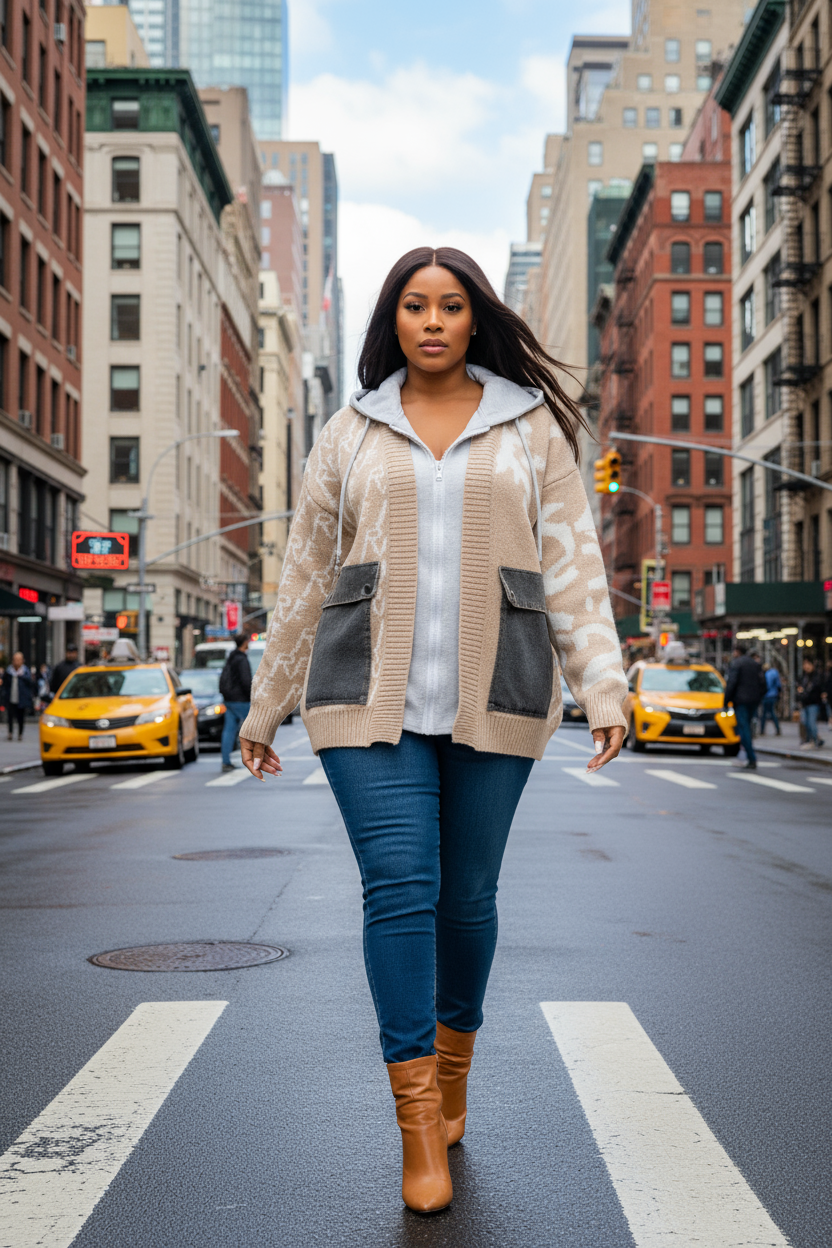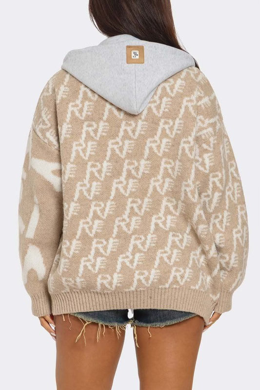 Layered knit cardigan with hoodie and front jean pockets