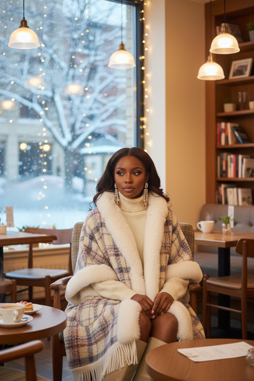 Introducing the Snuggle Poncho in One Size - a fringed plaid printed faux fur trim oversized cape coat with a hoodie! Experience the ultimate in cozy comfort with this luxurious piece. Perfect for chilly days, its fabric contents will keep you warm and stylish.