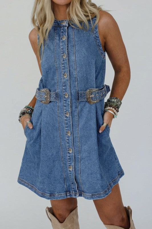 Western Denim Belted Button Down Sleeveless Dress S-XL