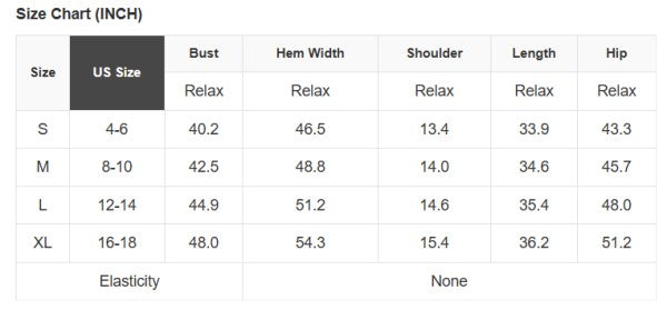 See size chart for approximate measurements