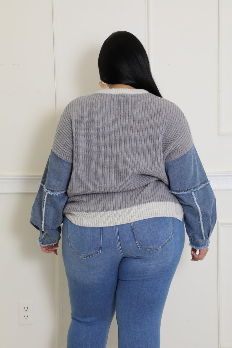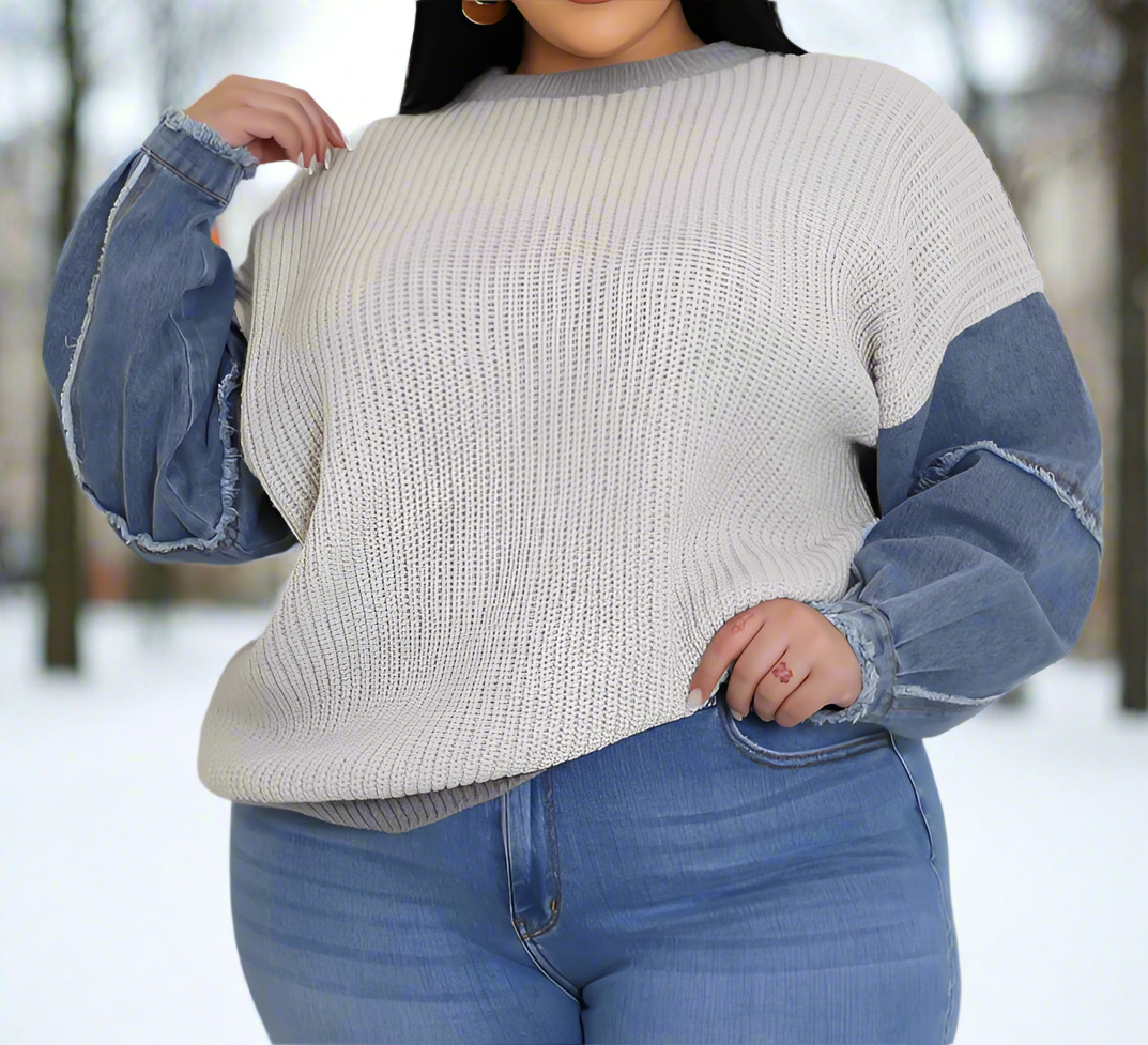 Stretch sweaterRound necklineLong sleeveDenimKnitted100% PolyesterHand wash coldModel is wearing a 2X