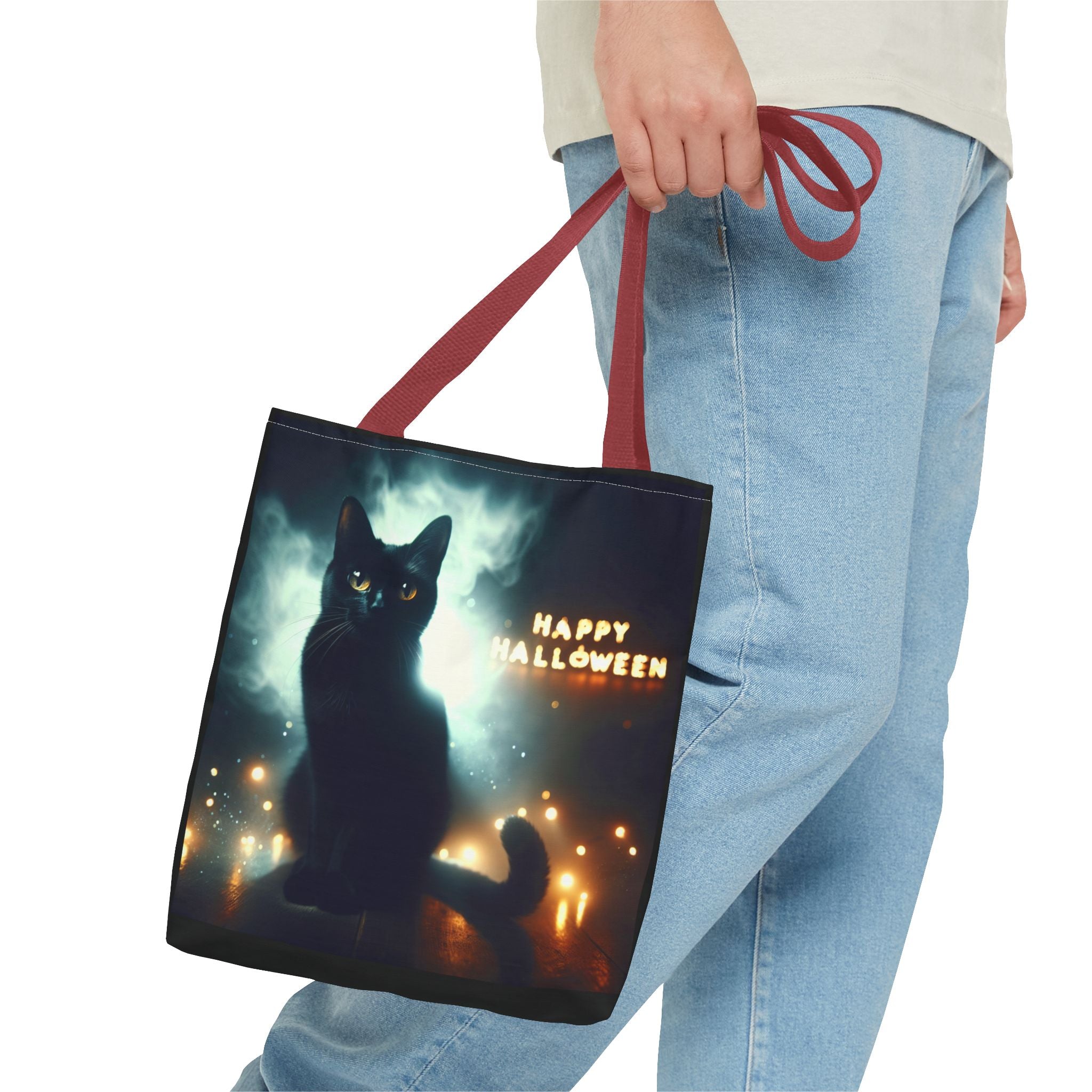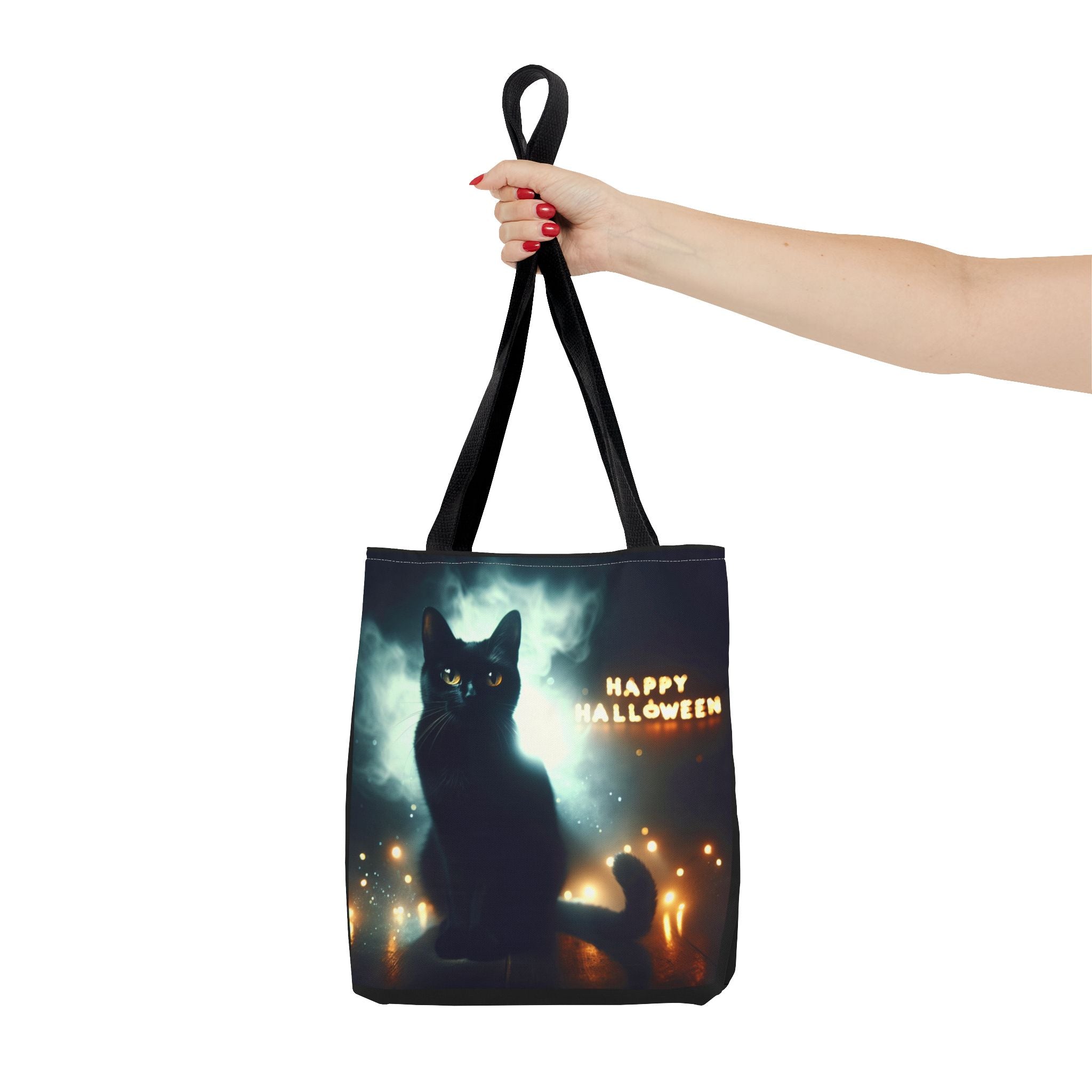 Spooky and festive Black Cat candy bag or gift bag perfect for Halloween. Made with durable polyester, featuring black handles. Ideal for those looking for a high-end, visually striking tote bag for everyday use or Halloween festivities.
